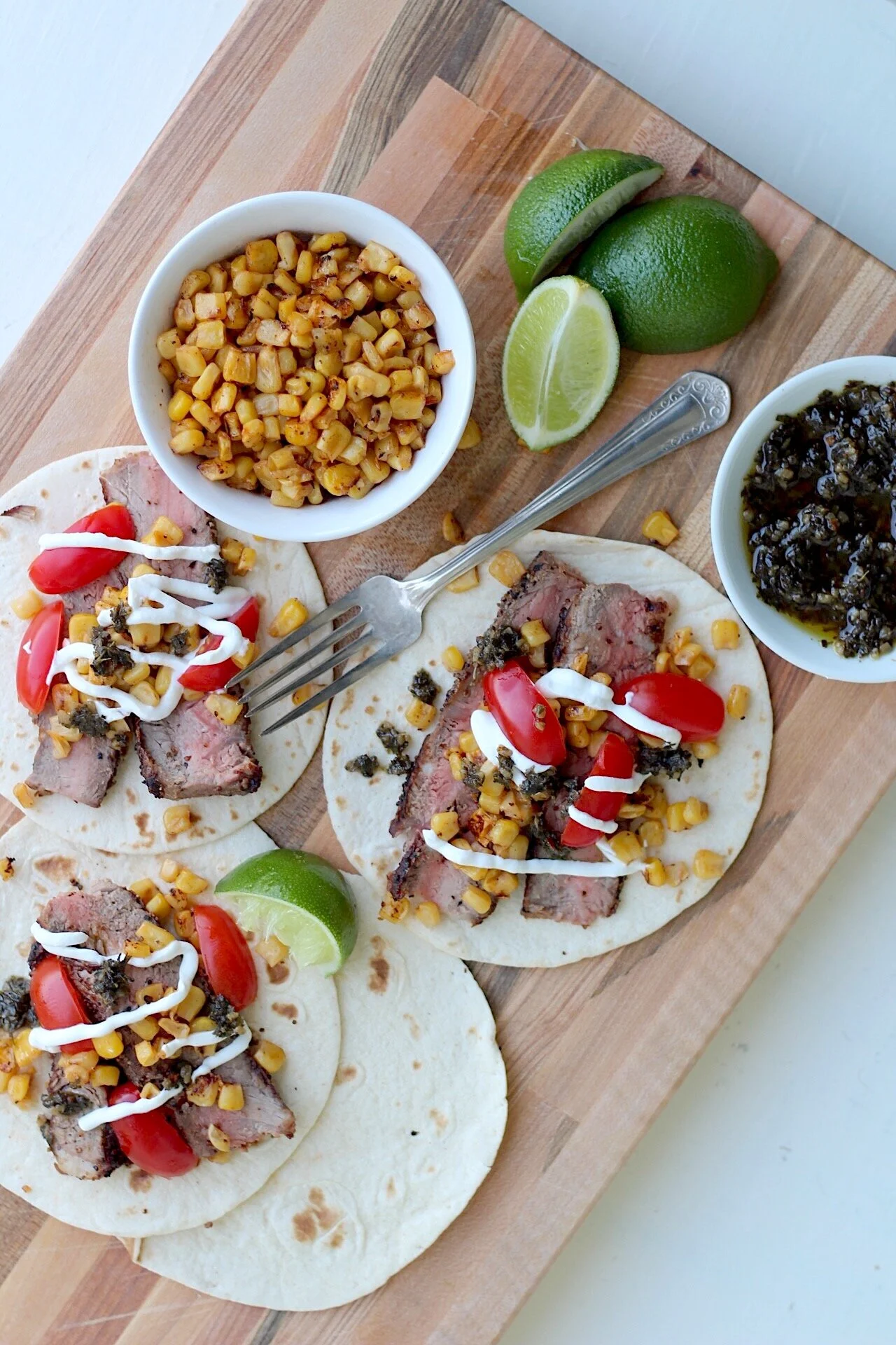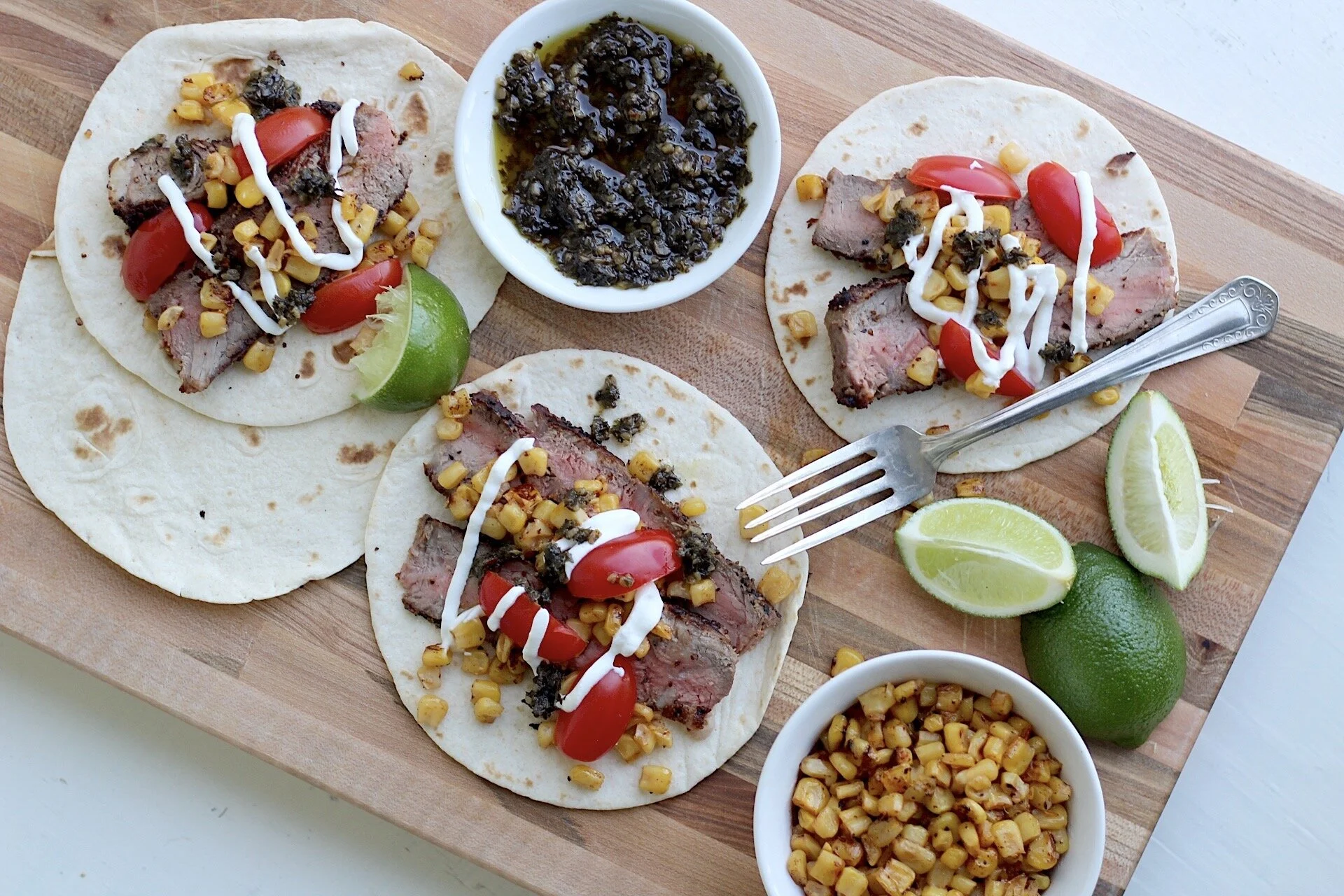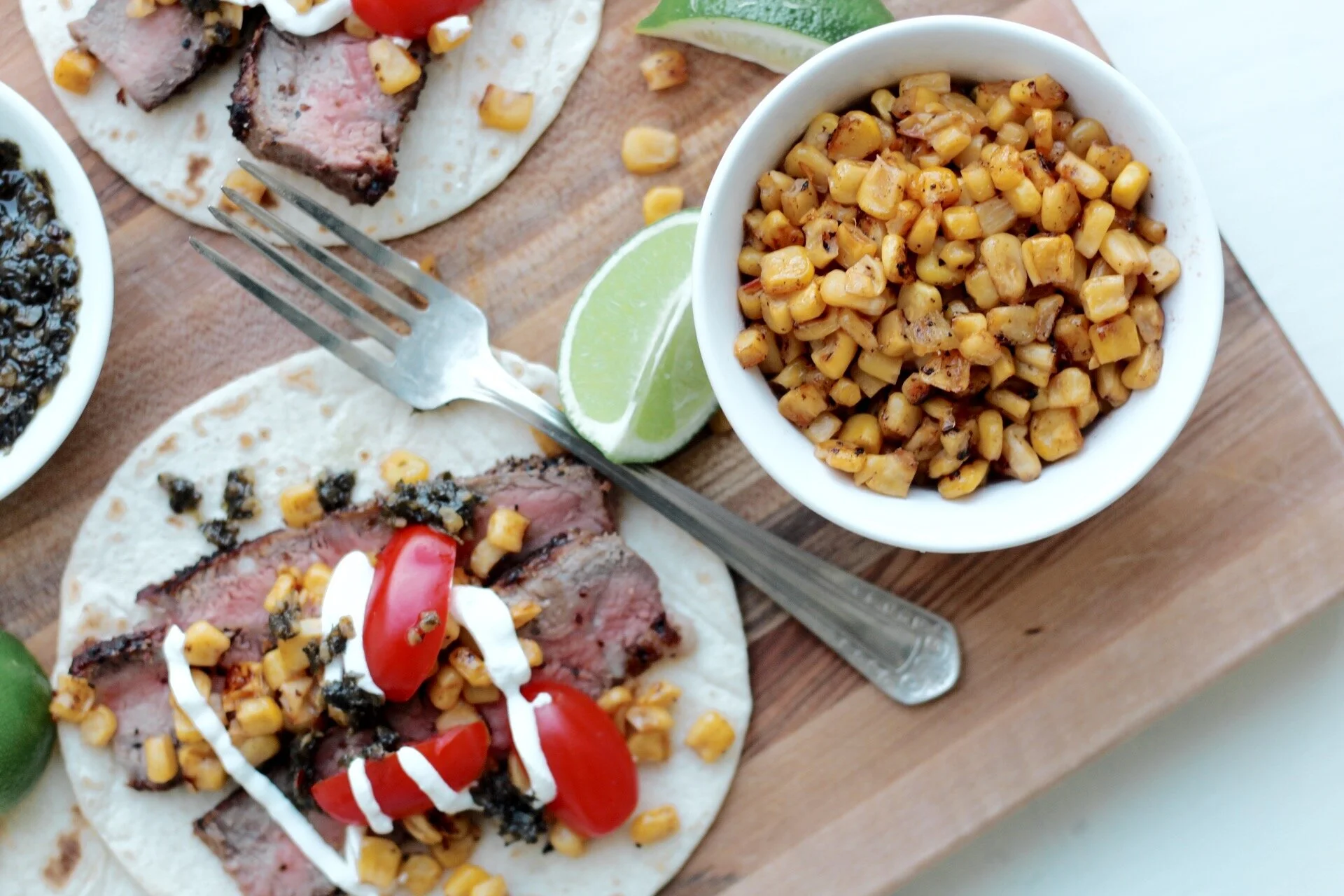 Warm tortillas and top with steak slices (2-3 per taco) and skillet corn. Add additional toppings as desired! Yields 6 Tacos