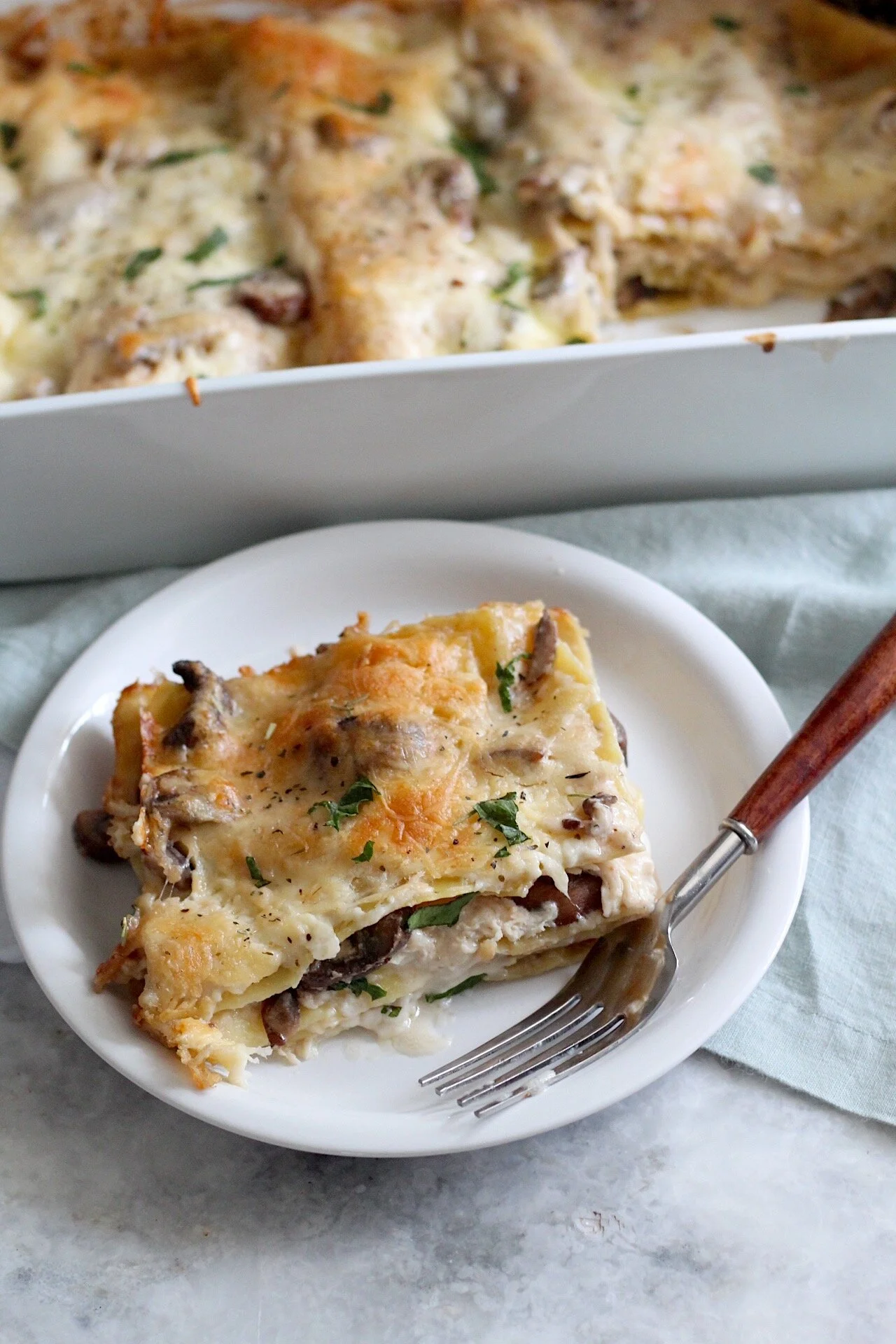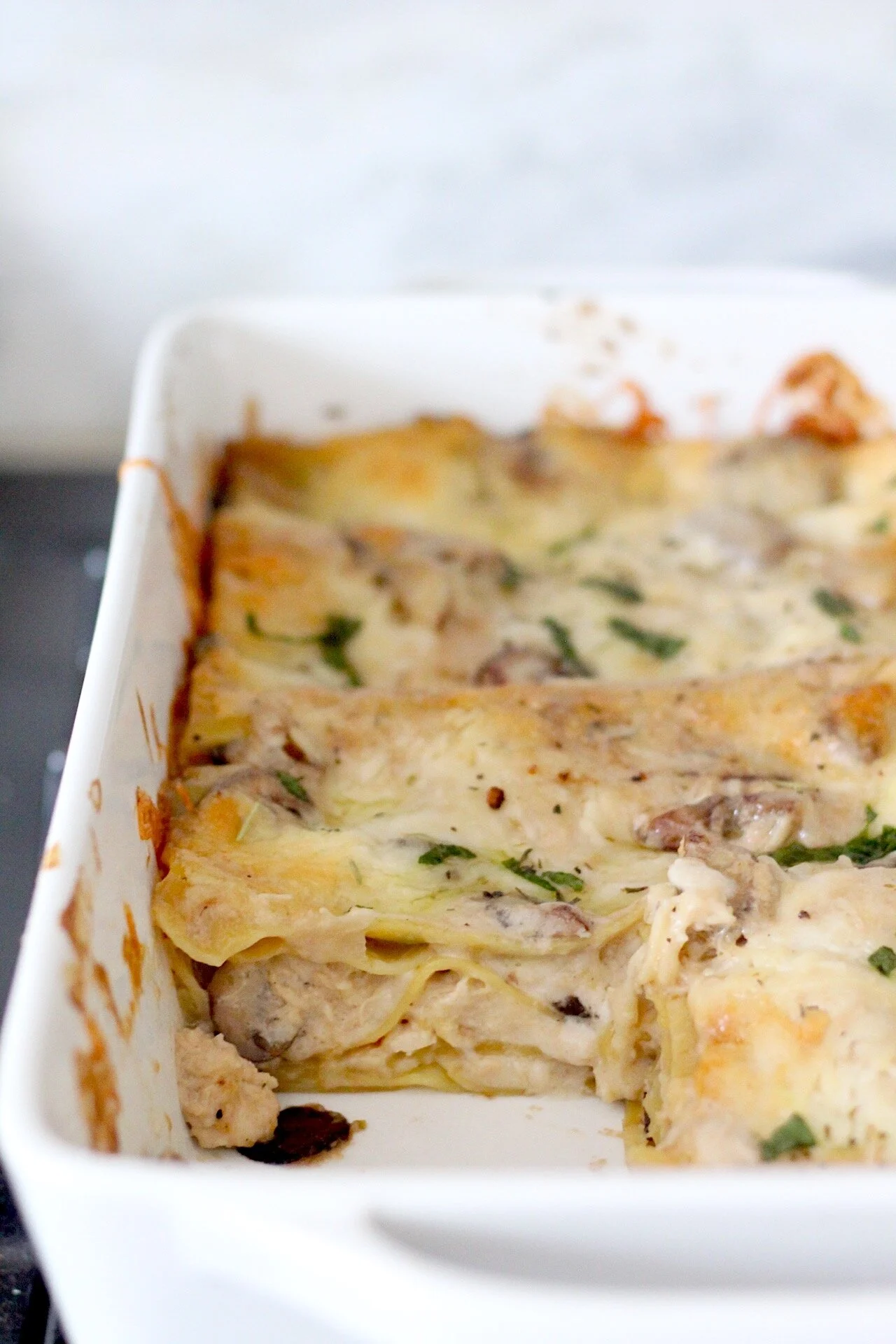 To assemble, lightly cover the bottom of a 9x13 inch baking dish with mushroom sauce.