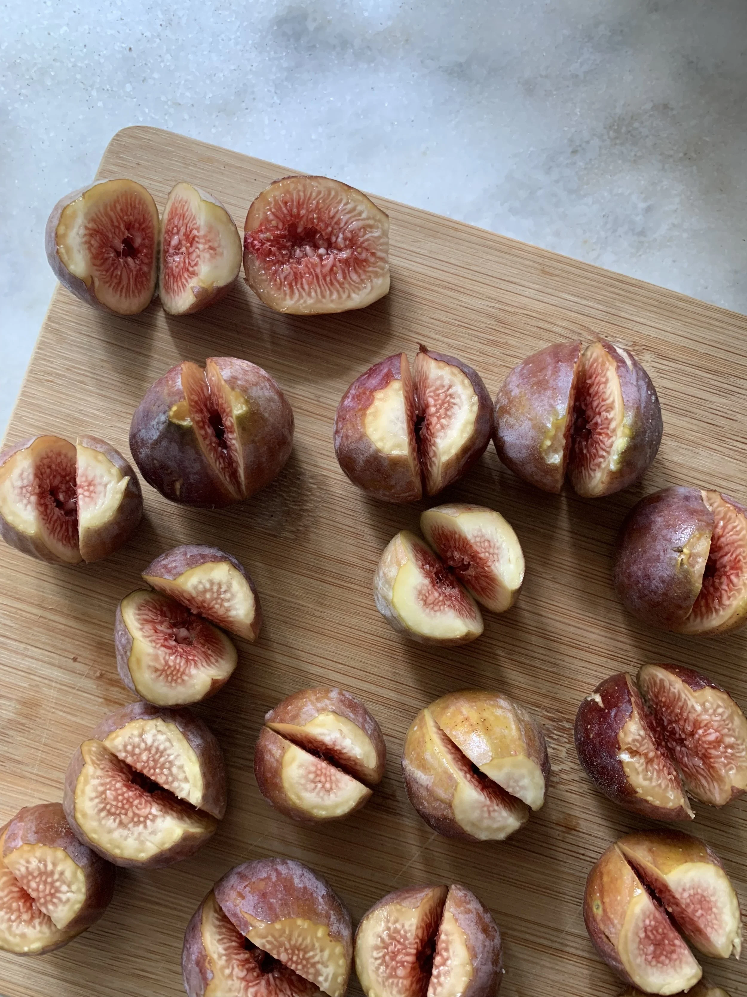 - Cut off the stem tip of the Fig, and then slice halfway down the center of each Fig.
